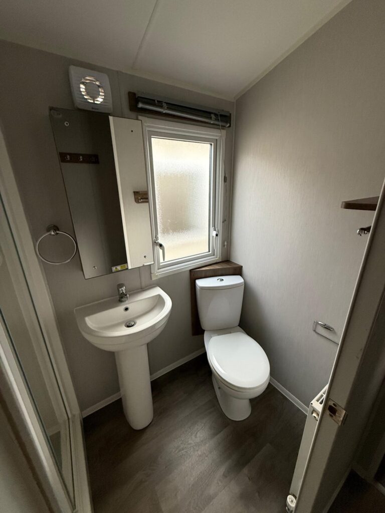 - Badkamer met douche cabine en wasbak
